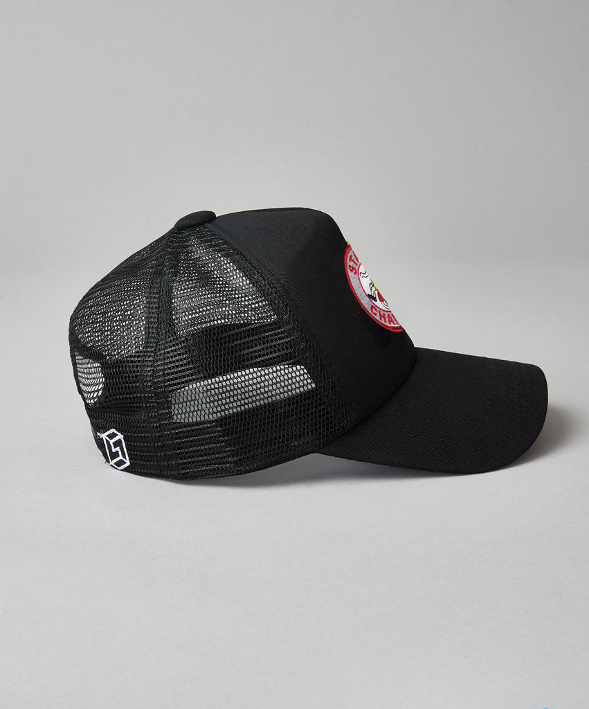 Featuring a black front panel and matching mesh back for breathability, it’s finished with the bold State Champion embroidered patch — complete with the wrestling mascot design seen in the film. It’s the ultimate nod to ’80s nostalgia, school spirit, and a movie that defined a generation.