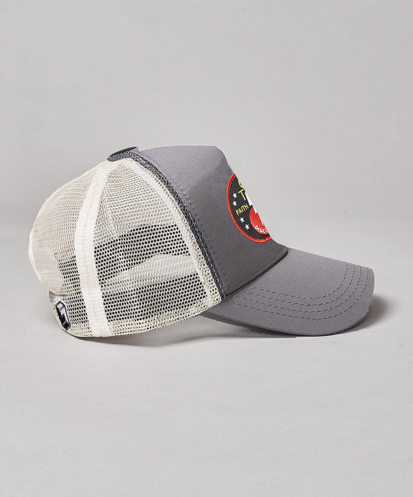 This small-fit grey and white trucker cap delivers easygoing comfort with a structured grey front, white mesh back, and curved peak. Finished with an adjustable snapback closure, it’s built for everyday wear with unmistakable rock ’n’ roll attitude.