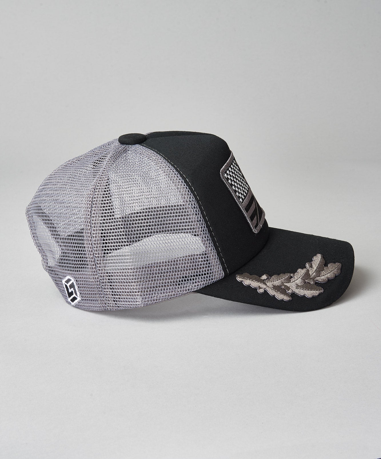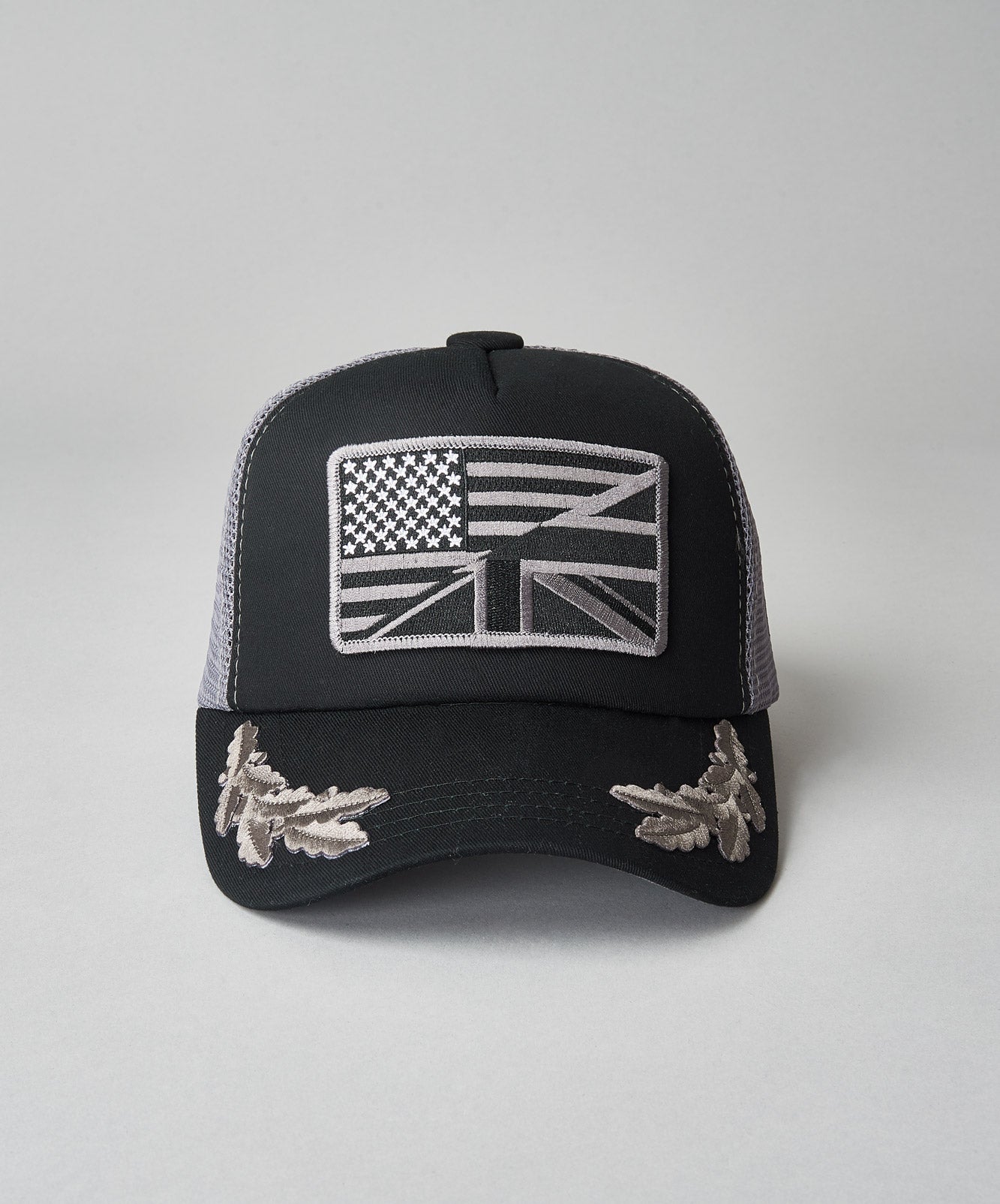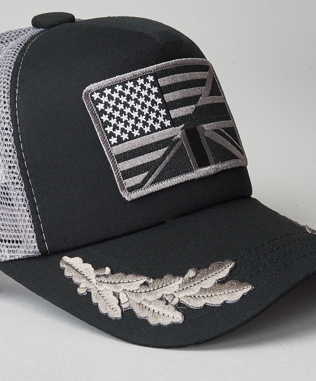 OUR MERGED FLAG PATCH IS A NOD TO LUCKY SEVENS UK ROOTS AND US INFLUENCE. THE TONAL GRAY AND BLACK PATCH FRONTS A CLASSIC BLACK TRUCKER WITH GRAY MESH BACK AND THE PEAK FEATURES GRAY EMBROIDERED CRESTS.
